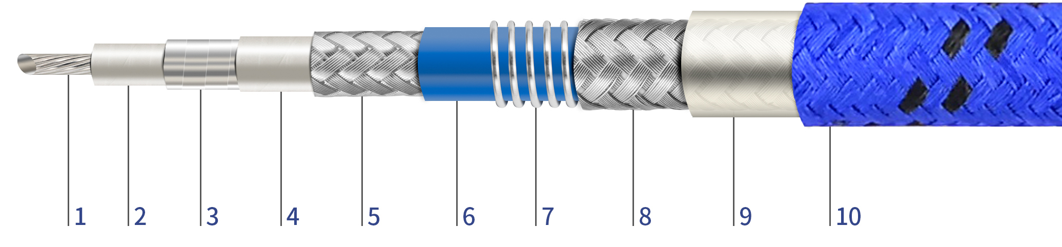 1.中心(xin)導體/銅鍍銀(單芯(xin)或多芯) 2.介質層/低(dī)密度PTFE 3.内層屏蔽/鍍(du)銀銅帶繞包 4.中間(jian)層/PTFE包覆 5.外編織層(céng)/鍍銀銅絲 6.外護套(tao)/藍色FEP 7.彈簧結構/不(bu)鏽鋼絲 8.外編織層(céng)/鍍銀銅絲 9.防水層(céng)/聚酰亞胺+PTFE 10.外護套(tao)/藍色PTFE絲 |