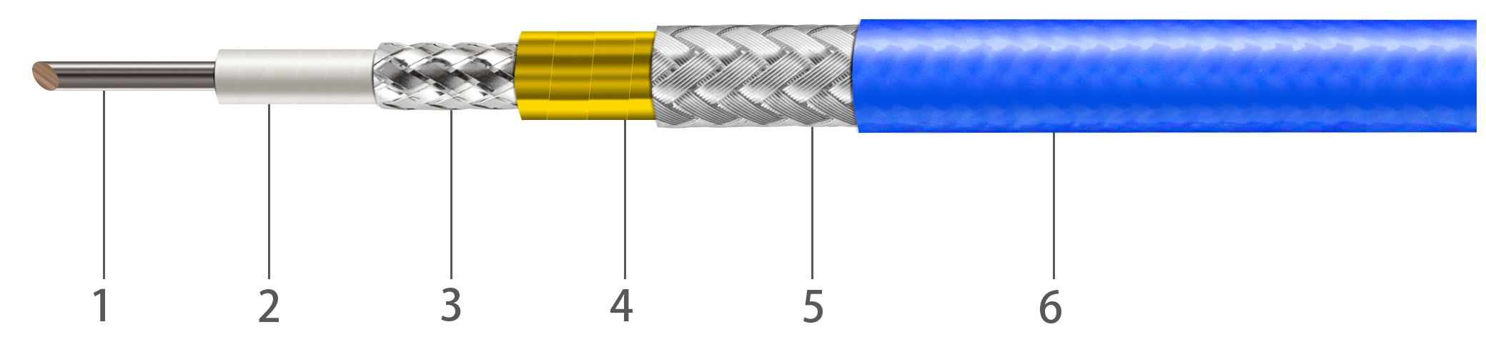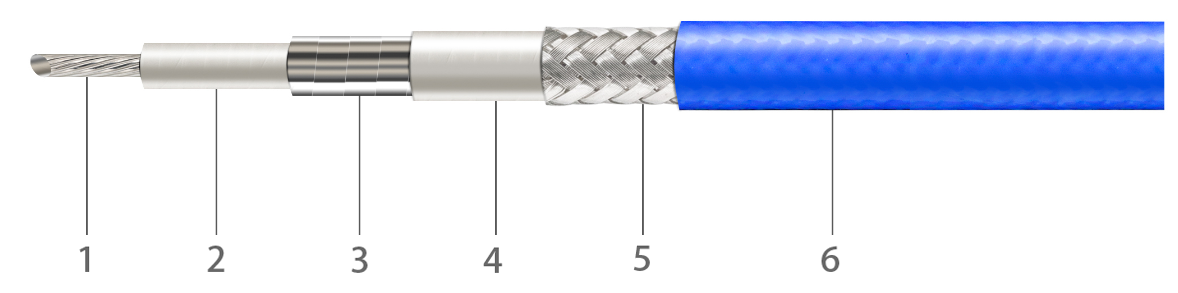 1.中(zhōng)心導體/銅鍍銀(單(dan)芯或多芯) 2.介質層(ceng)/低密度PTFE 3.内層屏蔽(bì)/鍍銀銅帶繞包 4.中(zhong)間層/PTFE包覆 5.外編織(zhī)層/鍍銀銅絲 6.外護(hu)套/藍色FEP |