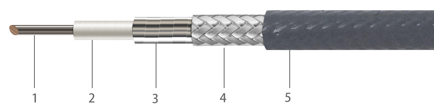 1.中心導體(tǐ)/銅鍍銀(單芯) 2.介質(zhi)層/低密度PTFE 3.内層屏(píng)蔽/鍍銀銅帶繞包(bao) 4.外編織層/鍍銀銅(tóng)絲 5.外護套/灰色PFA |