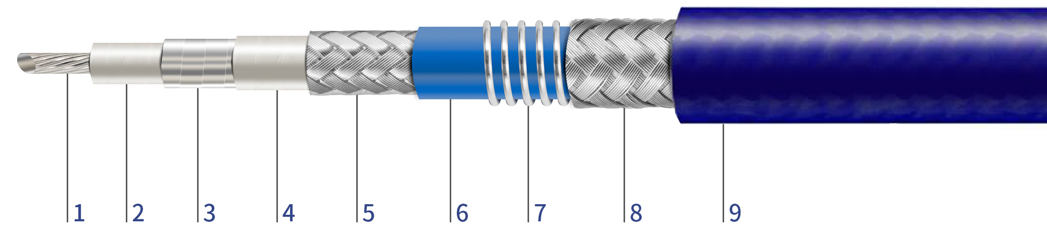 1.中心導體/銅鍍(dù)銀(單芯或多芯) 2.介(jiè)質層/低密度PTFE 3.内層(céng)屏蔽/鍍銀銅帶繞(rao)包 4.中間層/PTFE包覆 5.外(wai)編織層/鍍銀銅絲(sī) 6.外護套/藍色FEP 7.彈簧(huáng)結構/不鏽鋼絲 8.外(wài)編織層/鍍銀銅絲(sī) 9.外護套/藍色PUR |