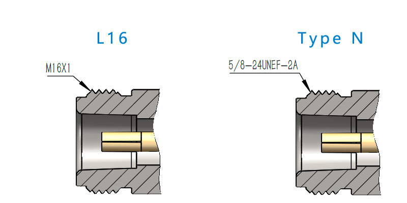 L16是一(yī)種中國的連接器(qì)産品,尺寸規格與(yǔ)N型連接器基本一(yi)緻,隻有螺紋标準(zhǔn)不同,N型爲英制螺(luó)紋5/8-24UNEF,而L16爲公制細牙(ya)螺紋M16X1,螺紋尺寸接(jie)近,但不完全兼容(róng)。見下圖: